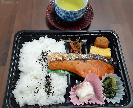 朝ごはんは前日にスーパーで購入した鮭弁当。