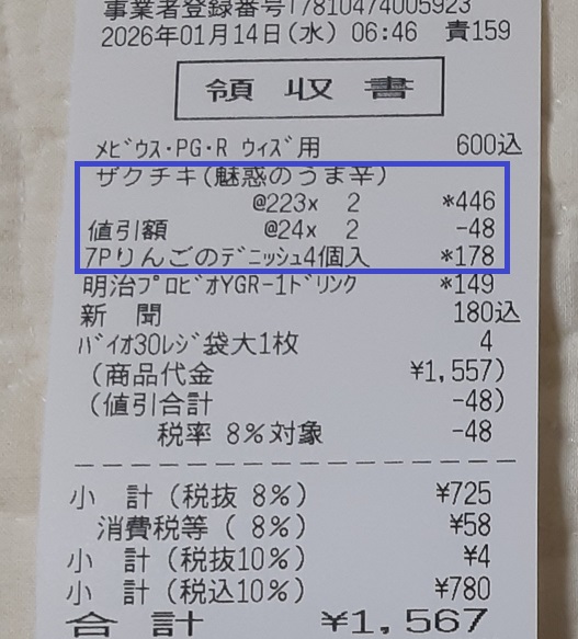 今朝は「値引き中ですよ」と店員が教えてくれたザクチキを追加。