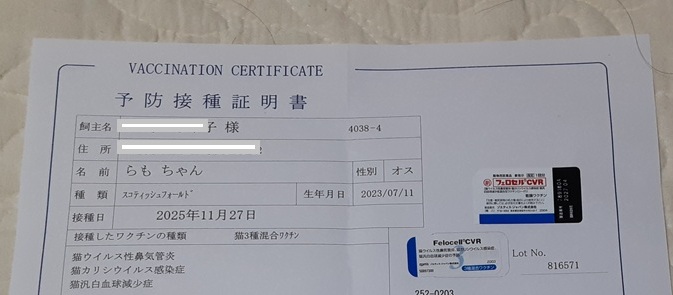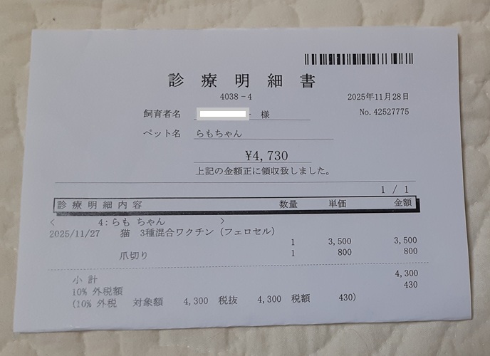 『完全家猫』なので5種ではなく3種混合ワクチンです